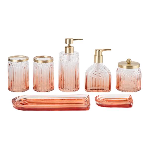 PROFILE 7pcs Glass Bathroom Accessories Countertop Set Round With Circle Line Ombre Orange With Mat Gold Parts Soap Pump Images |